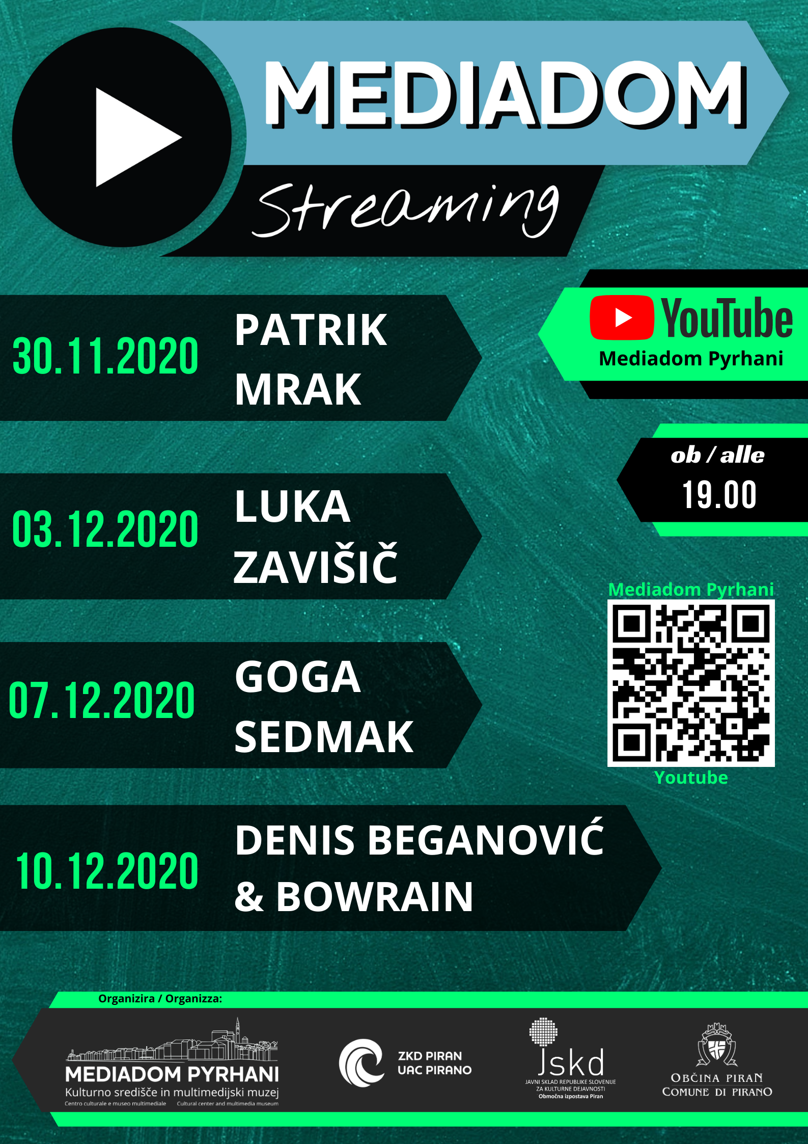 Mediadom Pyrhani, v so-organizaciji z Zvezo kulturnih društev Piran ter OI JSKD Piran organizira tretji sklop koncertov »Mediadom Streaming«. Prvi in drugi sklop koncertov sta presegla pričakovanja, zato smo se odločili da nadaljujemo s projektom in ga nekoliko nadgradimo.  Koncerti v živo bo potekali v prazni dvorani Mediadoma, v času, v katerem ponovno niso dovoljene javne prireditve. Prenosi v živo (streaming) bodo potekali vsak ponedeljek in četrtek na uradnem Youtube kanalu Mediadom. Premostili smo začasne prepovedi in omejitve glede večjih prireditev in podprli umetnike, ki so v danih razmerah v zelo nezavidljivem položaju.